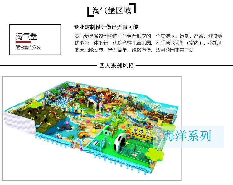 特点:材质坚韧耐磨,防水易清洁,色彩鲜艳明亮,主题独特,使用灵活方便。这款淘气堡采用最先进和安全的游乐设备。一般容纳的人数以场地大小为基准,是目前最受欢迎和热销的淘气堡。主要为门票销售,我司承诺采用先进与质量并存的设备提供小朋友游乐,让顾客感受到,自己的小朋友沉浸在这欢乐的海洋中。